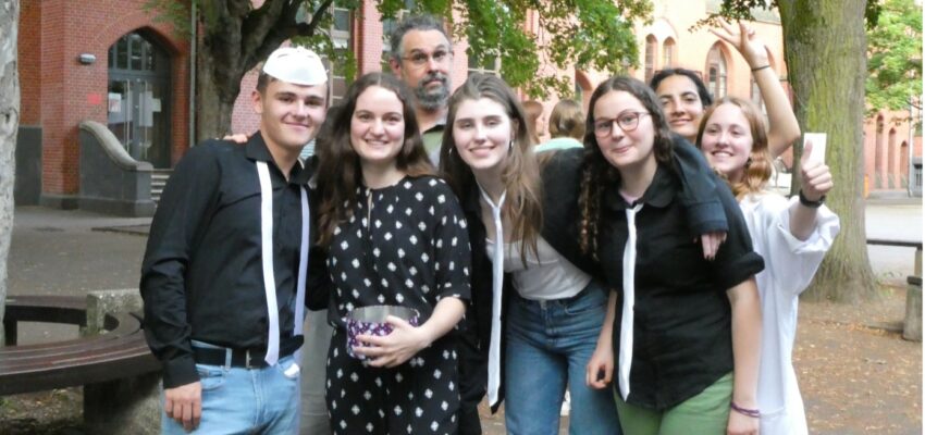 Im Rahmen der Fortbildung kreativ und organisiert, an der ich 2021teilnahm, entwarf ich meine Idee zum Anne-Frank-Projekt. In die spätere Projektarbeit waren die Freie Schauspielerin Nora Koschel und der Musiker Mario Geckeler sowie das Jüdische Museum in Frankfurt sowie Anne Frank e.V. Berlin und das Hessische Staatstheater Wiesbaden involviert. Netzwerkarbeit war hier zentral. Denn über den Kontakt zur der Theaterpädagogik des Hessische Staatstheaters kam der Kontakt mit der Freien Schauspielerin und dem Musiker zustande. Die Idee, mit der Stückeentwicklung Anne Frank – ein Mädchen von heute? an den Schultheatertagen des Hessischen Staatstheaters teilzunehmen, ging auch auf die Theaterpädagogik zurück. Das Stück kam sowohl im Rahmen der Schultheatertage am 30.03.2023 im Studio des Theaters Wiesbaden zur Aufführung als auch anlässlich des Geburtstags von Anne Frank am 12. Juni 2023 in der Aula der Schule. Des Weiteren konnte für die Zeit von vier Wochen die Ausstellung mit dem Titel Lasst mich ich selbst sein, die über Anne Franks Leben und die Zeit des Nationalsozialismus informierte, an die Schule geholt werden. In zwei ganztägigen Schulungen wurden Schüler und Schülerinnen zu Peer Group Guides durch die Mitarbeiter von Anne Frank e.V. Berlin ausgebildet. Der Besuch des Jüdischen Museums Frankfurt hingegen eröffnete auf verschiedene Weise Zugänge zum Thema. Während die Ausstellung dort über das Leben der Familie Frank informierte, beschäftigten sich die Jugendlichen dort im Schreib-Workshop mit dem generationsübergreifenden Briefwechsel der Familie Frank. Anhand des Briefwechsels setzten sie sich mit Themen wie Krieg, Vertreibung und Heranwachsen in Krisenzeiten auseinander, in dem sie selbst aus ihrer Perspektive Antwortbriefe verfassten.